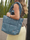 Bolso acolchado de cuero sintético con doble manija. Cierre de cremallera con puntera metálica y botón de imán, forro interno antifluido con tres compartimentos al interior, uno con cremallera y los otros dos abiertos. Sus medidas son 45cm x 30cm.